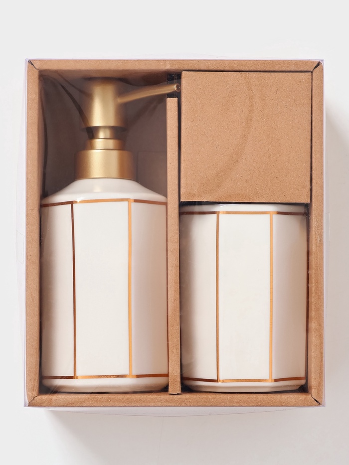 Керамический набор для ванной из двух предметов — практичное решение для поддержания порядка. Белый цвет и лаконичный дизайн легко вписываются в любой интерьер. Дозатор для мыла и стакан создают гармоничную композицию на раковине.