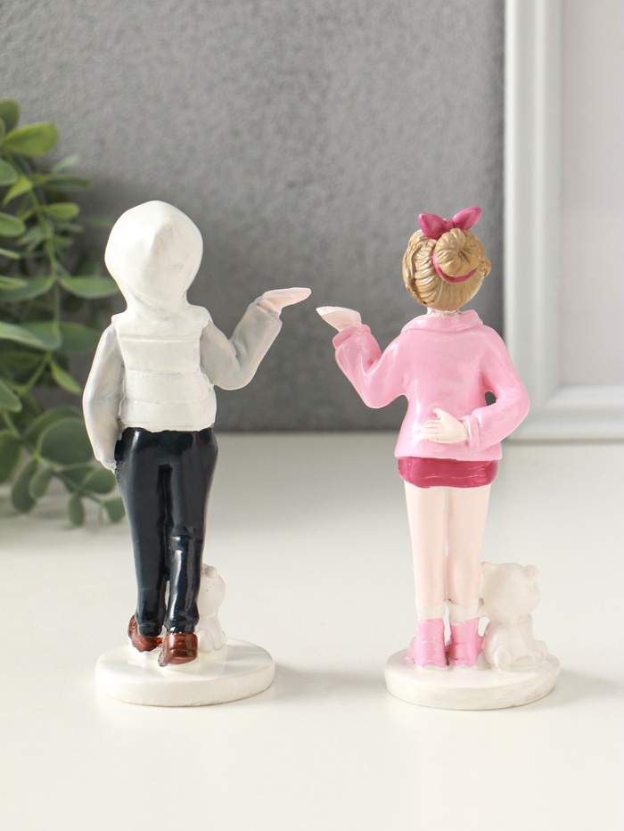 Этот набор из двух фигурок — трогательный символ юной дружбы и нежности. Мальчик и девочка с плюшевыми мишками в руках создают атмосферу тепла и искренних чувств, которая украсит интерьер или станет памятным подарком.