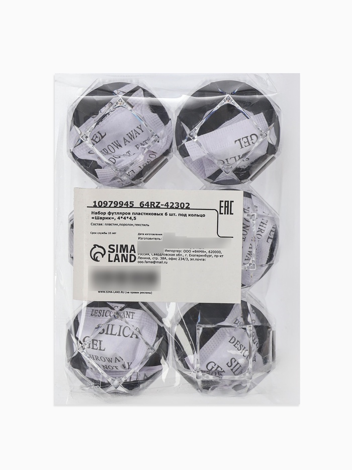 Технические характеристики Набор футляров под кольцо 6 шт. «Шарик», пластик, 4×4×4.5 см, вставка чёрная