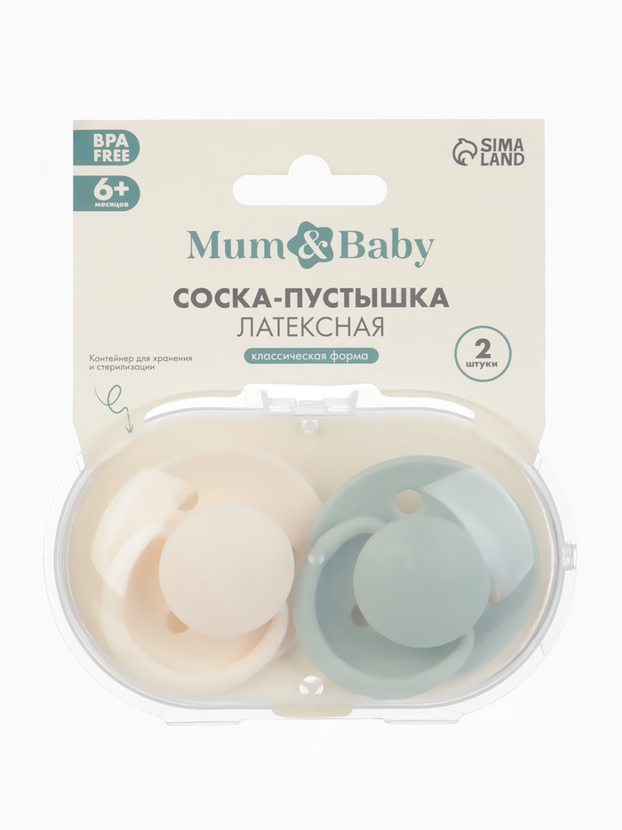 Технические характеристики Соски-пустышки, от 6 мес., латекс, классические, в контейнере, набор из 2 шт., айвори/зелёный, M&B