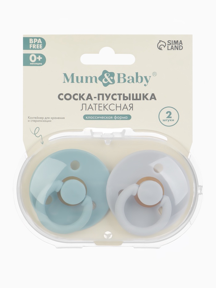 Технические характеристики Соски-пустышки, от 0 мес., латекс, классические, в контейнере, набор из 2 шт., серо-синий/серый, M&B