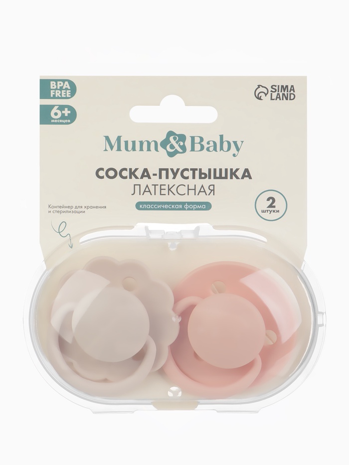 Технические характеристики Соски-пустышки, от 6 мес., латекс, классические, в контейнере, набор из 2 шт., нюд/персиковый, M&B
