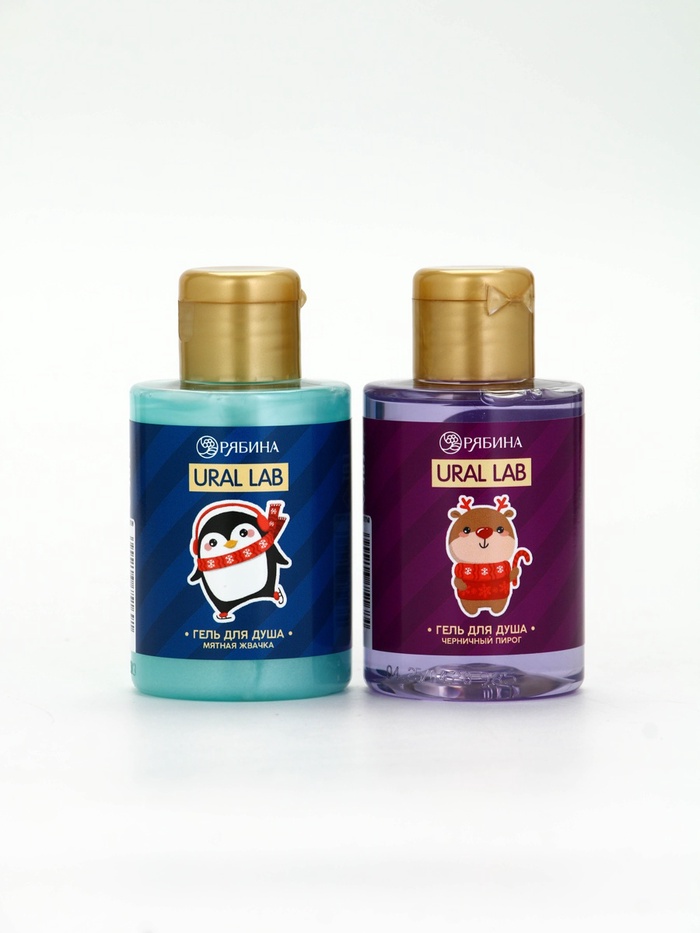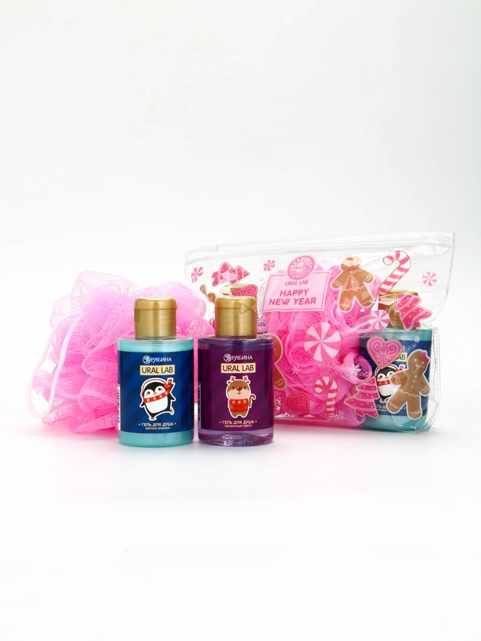 Набор косметики в косметичке, гели для душа, 2 х 100 мл и мочалка для тела