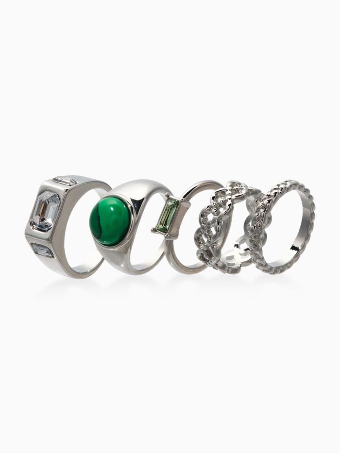 Набор колец 5 шт "Новый стиль" малахит, размер МИКС, цвет изумрудный в серебре