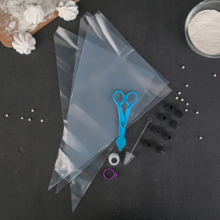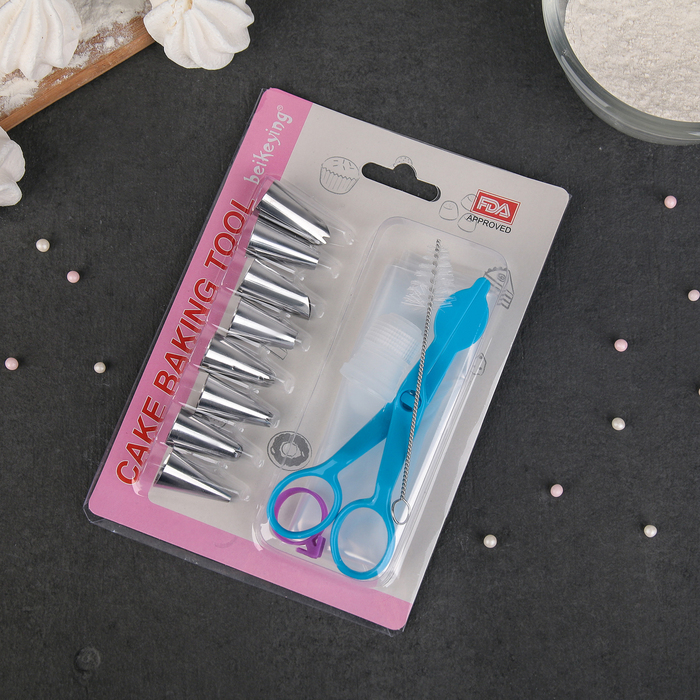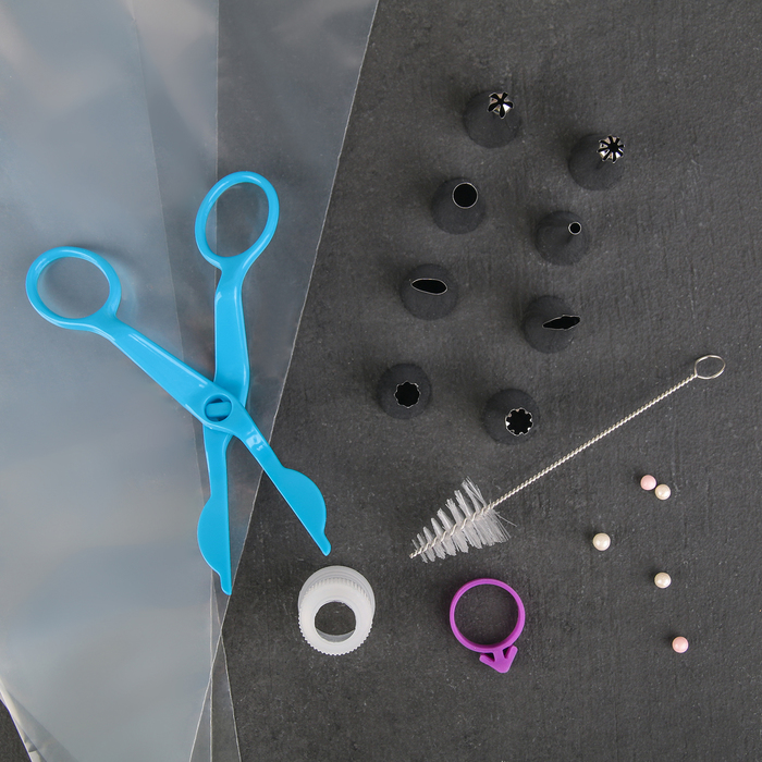 Набор кондитерский «Веста», 15 предметов: 3 мешка, щипцы, адаптер, зажим, 8 насадок, щёточка, насадки МИКС