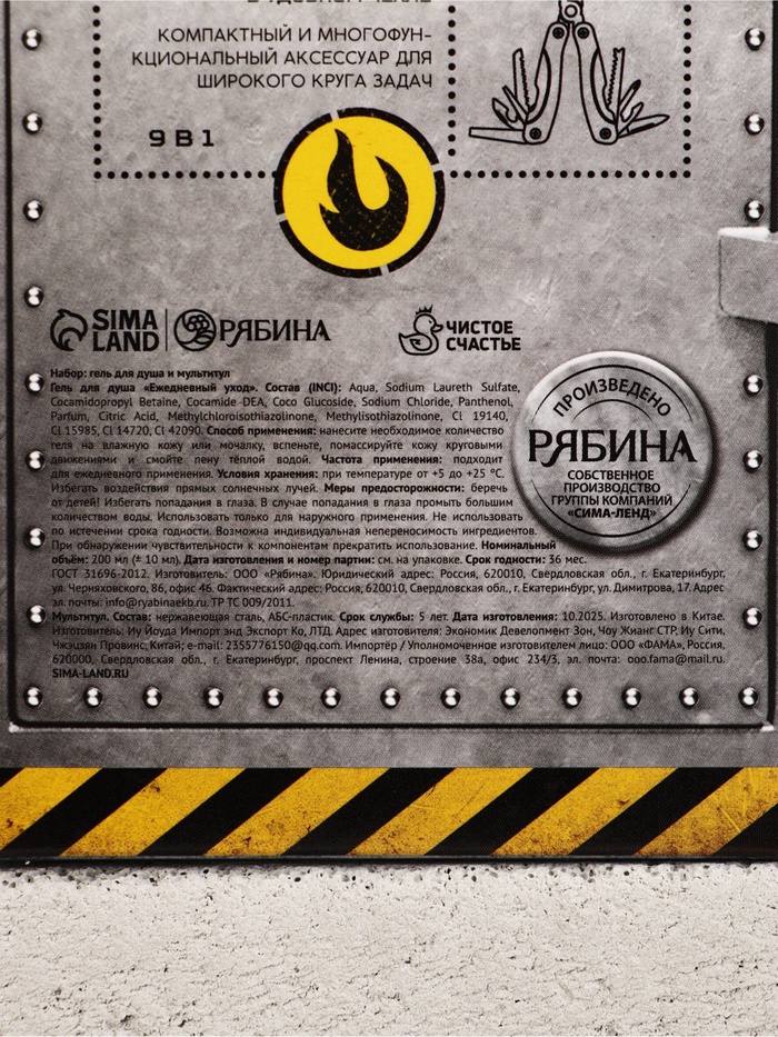 | Составляющие набора | Гель для душа; Мультитул |