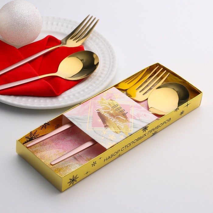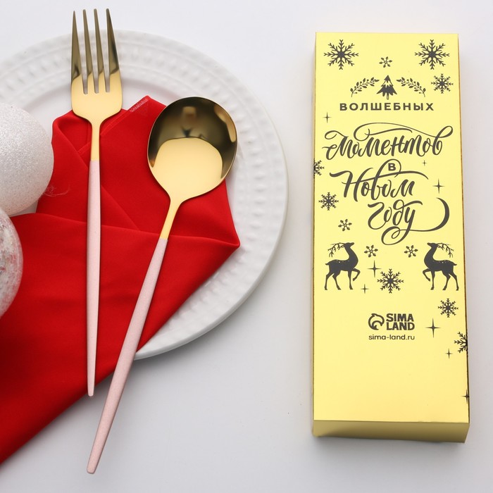 Набор столовых приборов - это оригинальный подарок, который отличается своим высоким качеством и оригинальностью дизайна. Набор включает в себя 2 предмета вилку и ложку, они подойдут как для повседневного использования так и для более атмосферного новогоднего застолья. Благодаря подарочной коробке это отличный новогодний подарок для мамы, бабушки, сестры или коллеги.