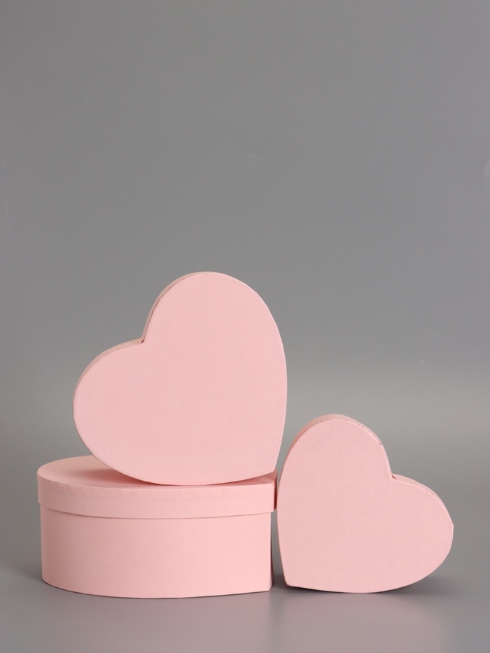 Три сердца для трёх подарков. Набор коробок-сердец пастельного розового цвета — это три разновеликие фигурные шкатулки из плотного картона 1200 г/м². Коробки вкладываются друг в друга или используются отдельно.
