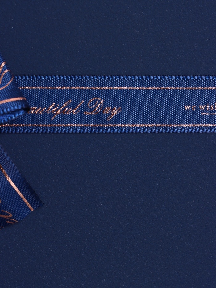 - Рисунок «бант» на крышке: Изображение ленты нанесено типографским способом. Не нужно завязывать настоящие банты, тратить ленты и время. Коробка выглядит празднично сразу после закрытия. Синий фон делает дизайн строгим, но нарядным.