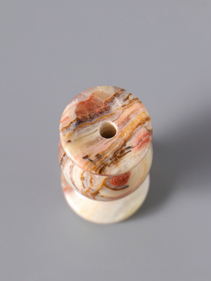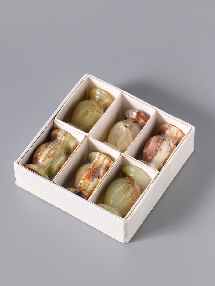 Набор из шести подсвечников из натурального оникса создаёт атмосферу умиротворения и торжественности. Каждый подсвечник уникален благодаря природному рисунку камня — от тёплых медовых до глубоких зелёных и коричневых прожилок. Компактный размер делает их универсальным решением для домашнего алтаря, праздничного стола или создания молитвенного уголка.