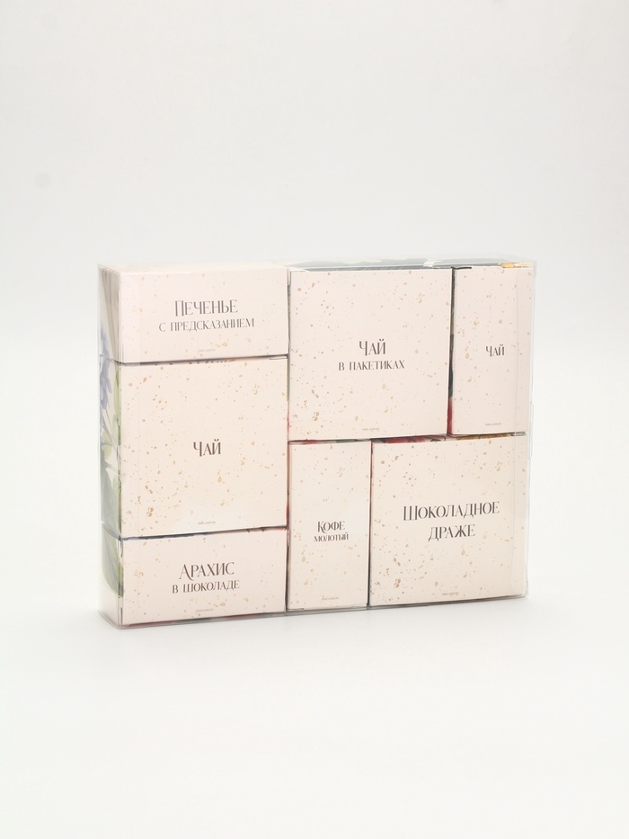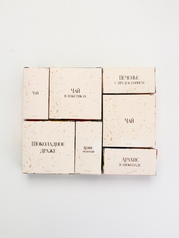 | Составляющие набора | Арахис; Драже; Кофе; Печенье с предсказанием; Чай |