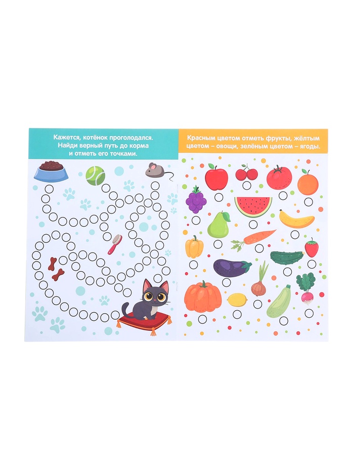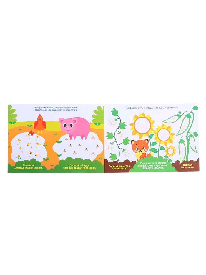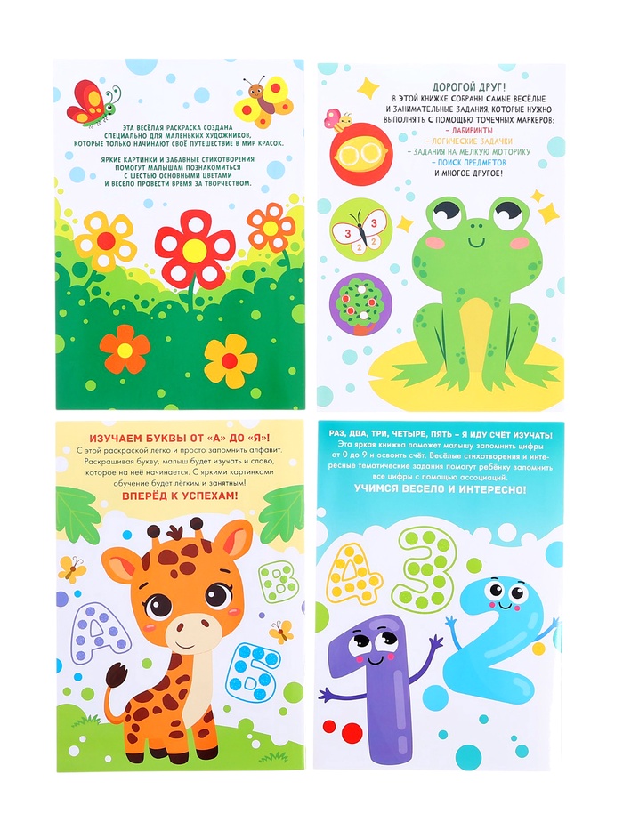 - Включает 8 раскрасок с изображениями животных, букв, цифр и надписей.