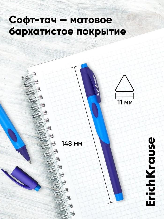 Эргономичная шариковая ручка Stick&Grip с покрытием Soft Touch, стандартным типом пишущего узла, заменяемым стержнем увеличенного объема и уникальной технологией Super Glide. Ручка имеет непрозрачный матовый круглый корпус, треугольную эргономичную грип-зону с выемками для пальцев и вентилируемый колпачок. 5-канальный пишущий узел с диаметром шарика 0.5 мм в сочетании с чернилами пониженной вязкости обеспечивает мягкое и быстрое письмо без усилий. Благодаря увеличенному резервуару стержня длина непрерывной линии составляет 2000 м при толщине 0.25 мм, что является одним из лучших показателей в своей категории.