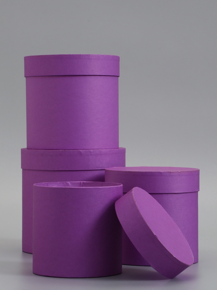 Нежное очарование весеннего настроения. Набор шляпных коробок «Светлая сирень» 4 в 1, 18×18 – 14×14 см – это комплект из четырёх цилиндрических коробок нежного сиреневого цвета. Плотный картон 900 г/м² и утончённый оттенок делают набор идеальным для упаковки подарков к 14 Февраля, 8 Марта и другим романтичным поводам.