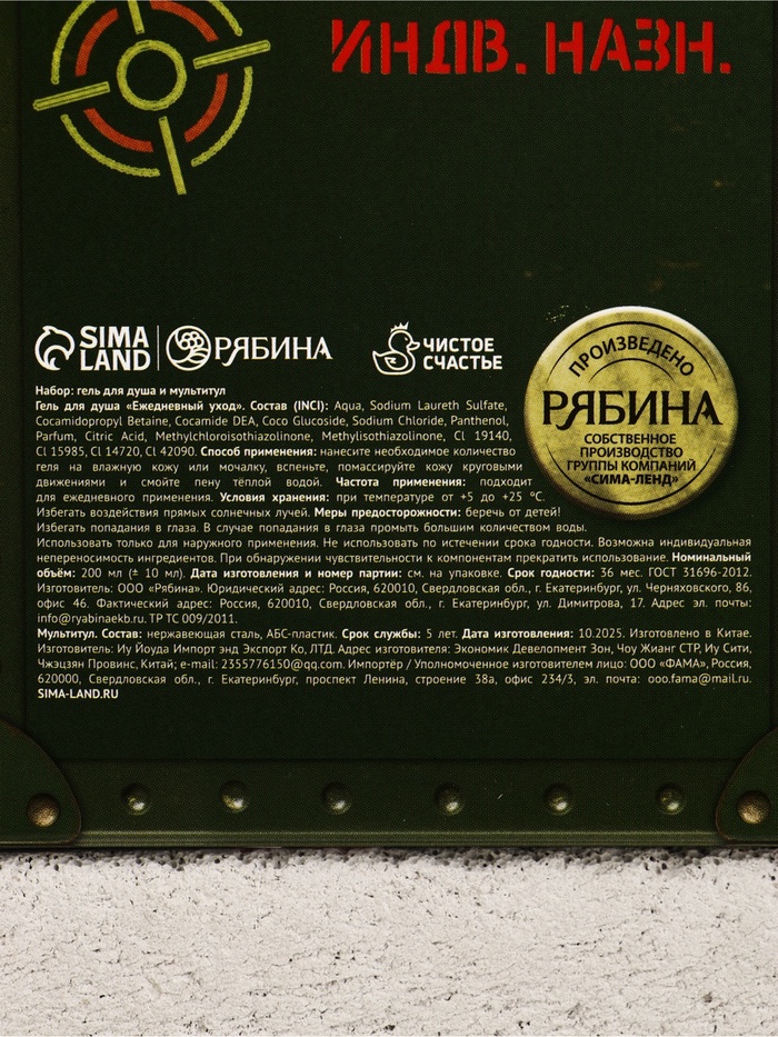 | Составляющие набора | Гель для душа; Мультитул |