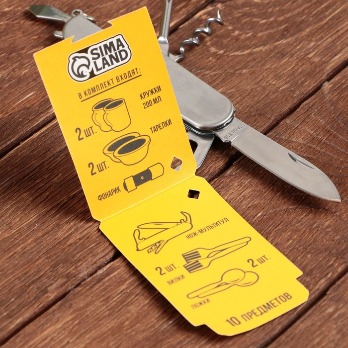 | Составляющие набора | Вилка; Кружка; Ложка; Мультитул; Тарелка; Фонарик |
