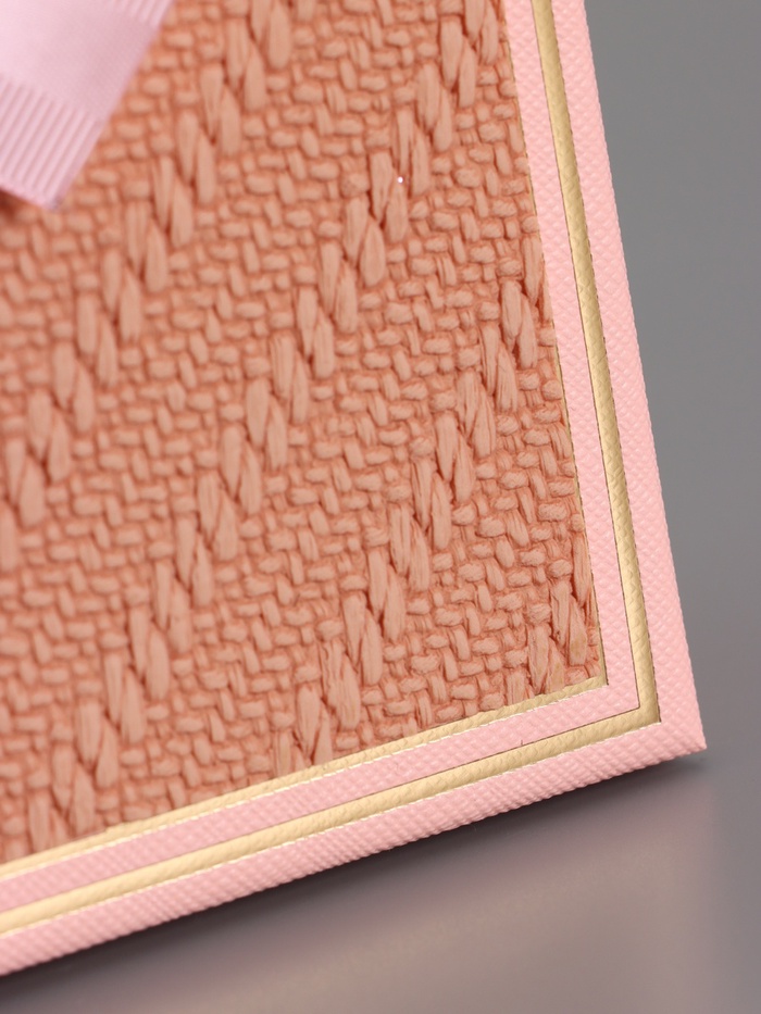 - Сдержанный дизайн с золотым тиснением: Нежно-розовый фон и золотые тиснёные банты создают праздничное, но не броское оформление. Такой дизайн уместен для романтических и женских праздников — 14 Февраля, 8 Марта, — а также для изящного подарка на день рождения.