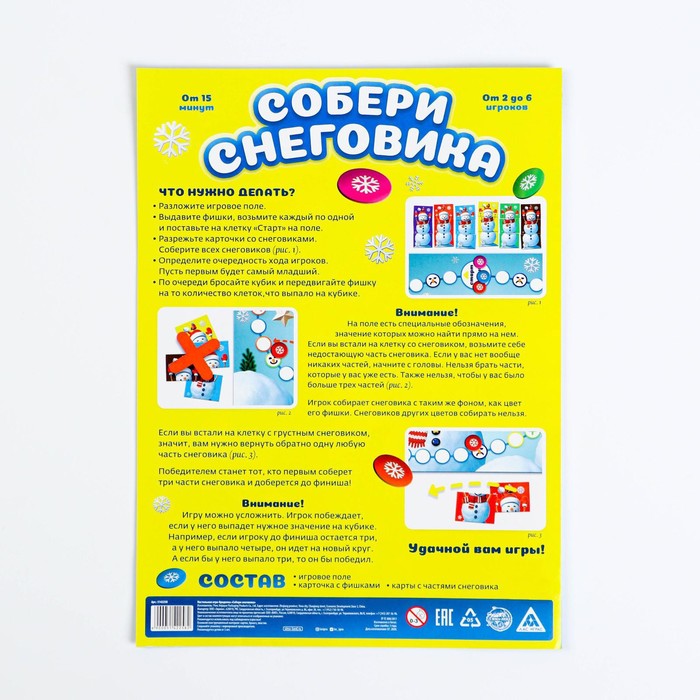 Разложите игровое поле. Разрежьте карточки со снеговиками. Соберите всех снеговиков и поместите их рядом с полем. Каждый игрок выбирает себе фишку и ставит её на клетку «Старт». Осталось только определить очерёдность хода и начать игру!