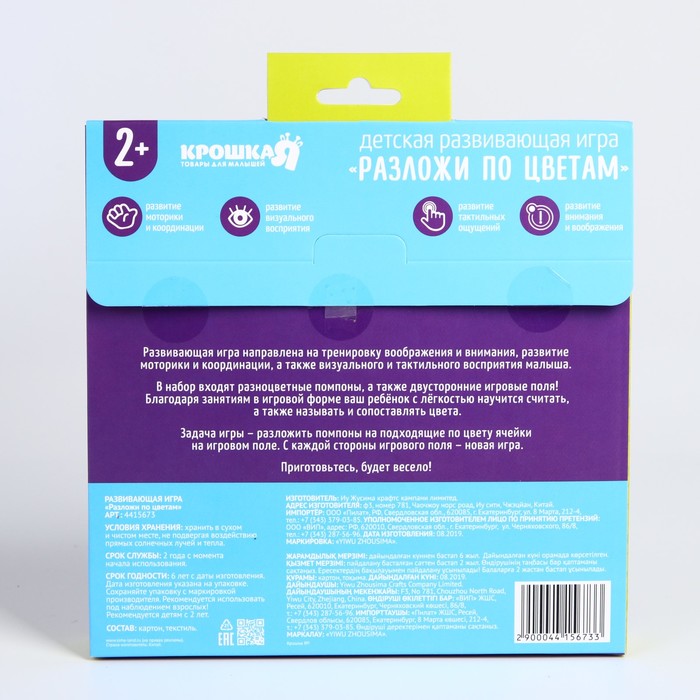 Развивающая игра направлена на тренировку воображения и внимания, развитиемоторики и координации, а также визуального и тактильного восприятия малыша.В набор входят разноцветные помпоны. а также двусторонние игровые поля!Благодаря занятиям в игровой форме ваш ребёнок с лёгкостью научится считать‚называть сопоставлять цвета а также различать предметы по размеру.Задача игры - разложить помпоны на подходящие по цвету и размеру ячейкина игровом поле. С. каждой стороны игрового поля - новая игра.