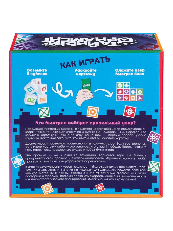Погружение в мир узоров и логики начинается с этой игры! Познакомьтесь с настольной игрой «Тайный орнамент» — занимательным набором для детей, который сочетает в себе карточки, кубики и элементы головоломки. Простые правила делают игру понятной уже с 3 лет, а процесс складывания узоров превращается в увлекательное открытие для маленьких исследователей.