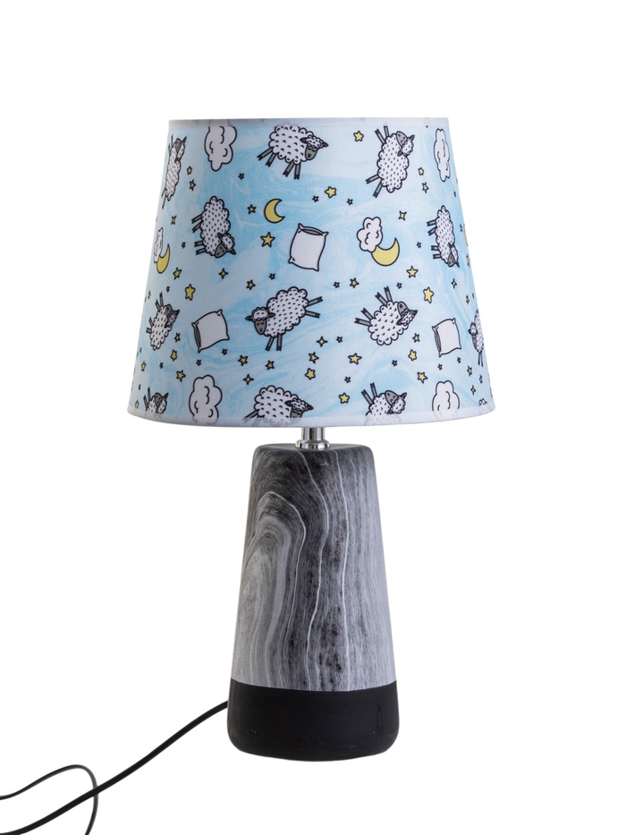 - Пластиковый абажур голубого цвета: Конический абажур из матового пластика равномерно рассеивает свет по сторонам. Голубой оттенок создает спокойную атмосферу и снижает зрительную нагрузку.