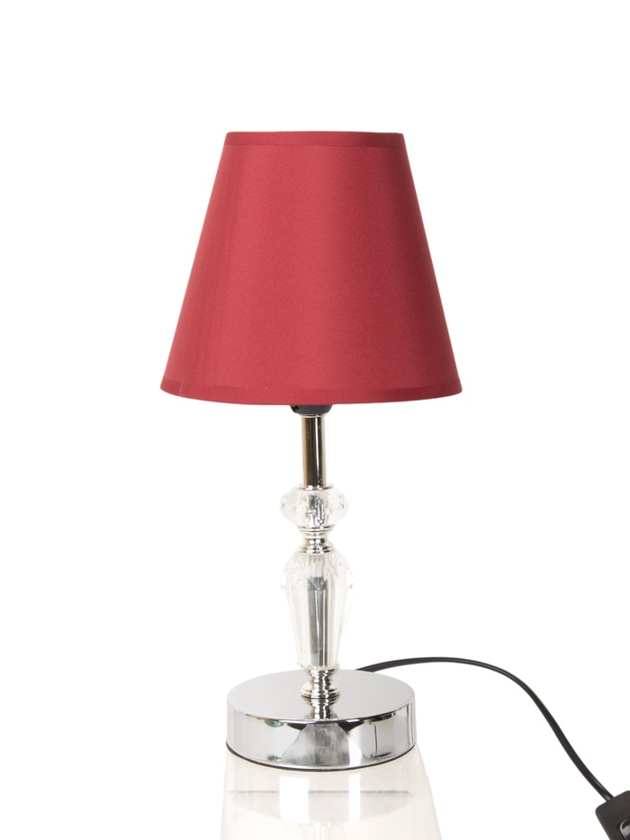 - Контрастная цветовая гамма: Хромированное металлическое основание с элементами стекла сочетается с глубоким бордовым абажуром. Такой дуэт выглядит современно и подходит для интерьеров с акцентными цветовыми решениями.