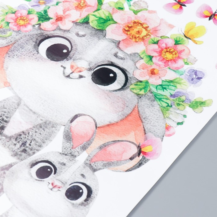 Наклейка интерьерная цветная «Мама зайка в цветочном венке с зайчатами», 40×60 см