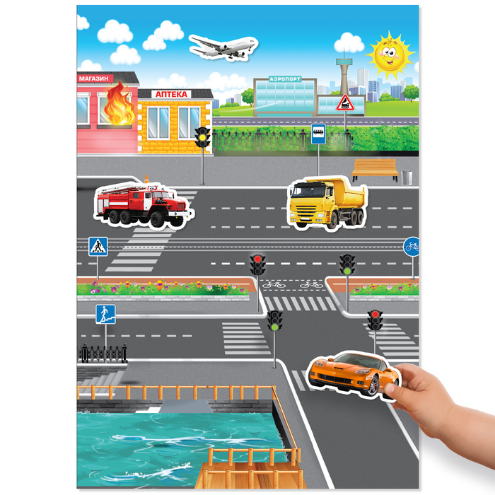 Внутри книги малыш найдёт плакат и будет крепить на него наклейки.