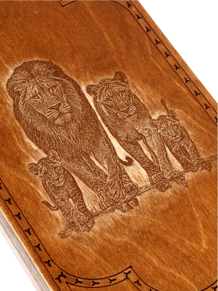 - Декоративная гравировка: Изображение львиной семьи аккуратно нанесено на поверхность доски и подчеркивает природную текстуру дерева, добавляя изделию выразительный характер.