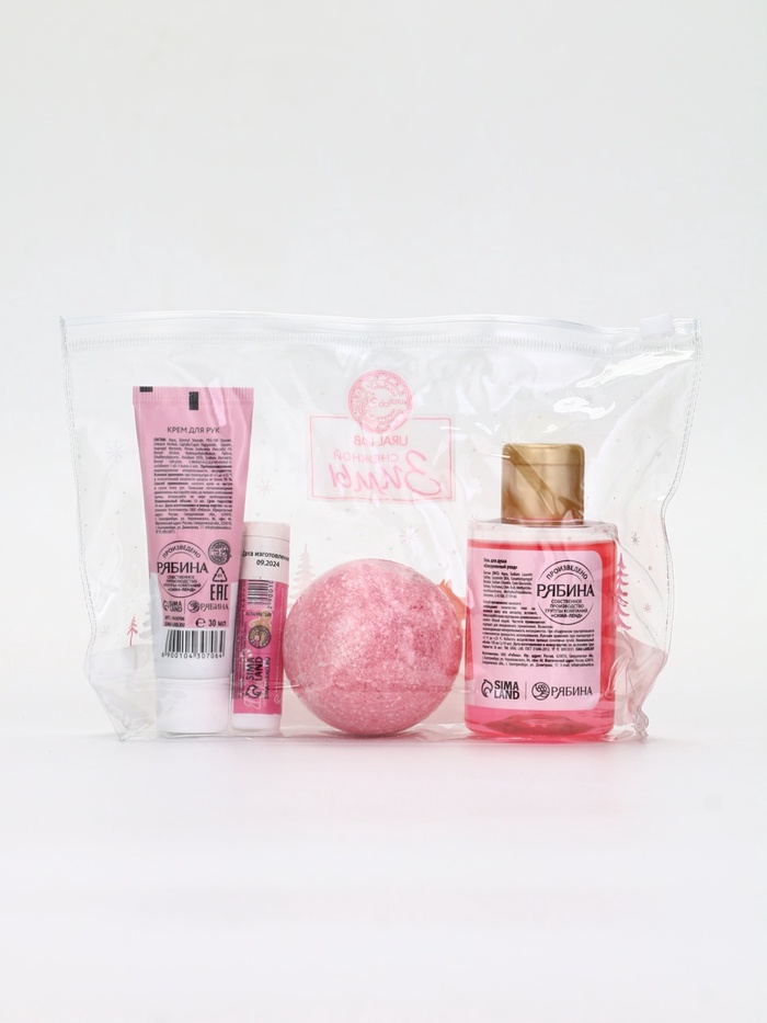 | Составляющие набора | Бальзам для губ; Бомбочка для ванн; Гель для душа; Косметичка; Крем для рук |