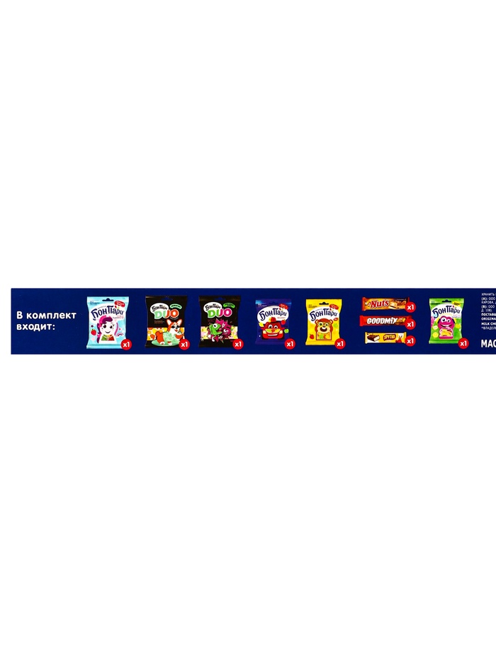- 9 видов сладостей: В наборе представлены разные вкусы и текстуры. Сочетание шоколада, мармелада и маршмеллоу подходит для компании из нескольких человек.