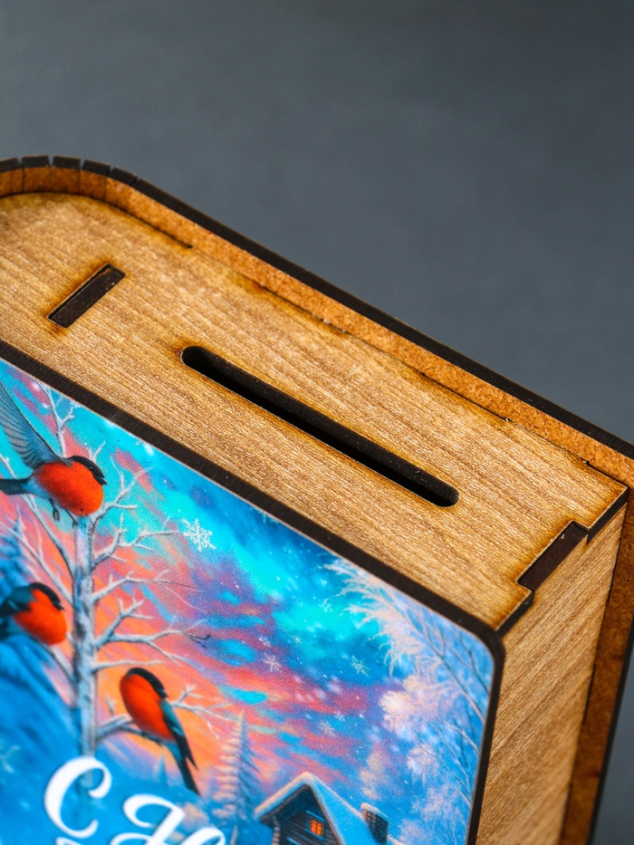 - Прочный материал ЛХДФ с качественной печатью: копилка долго сохраняет свой нарядный вид.