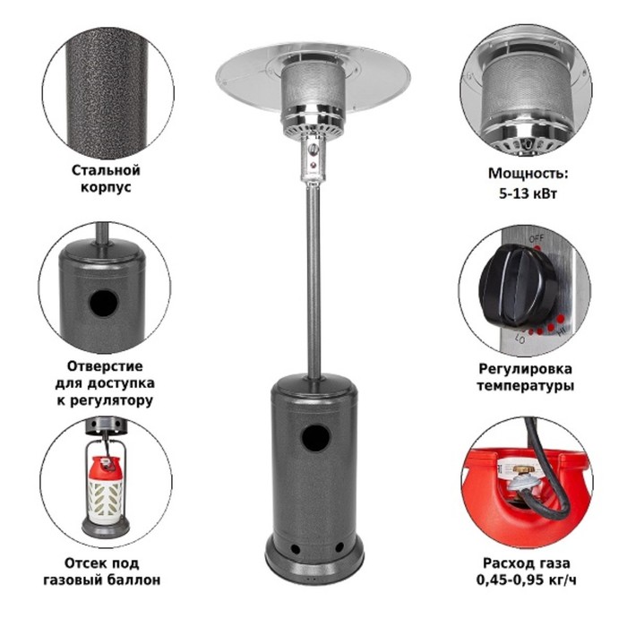 Технические характеристики Обогреватель газовый, уличный, 81 × 45 × 219 см, серый, Aesto A-01T