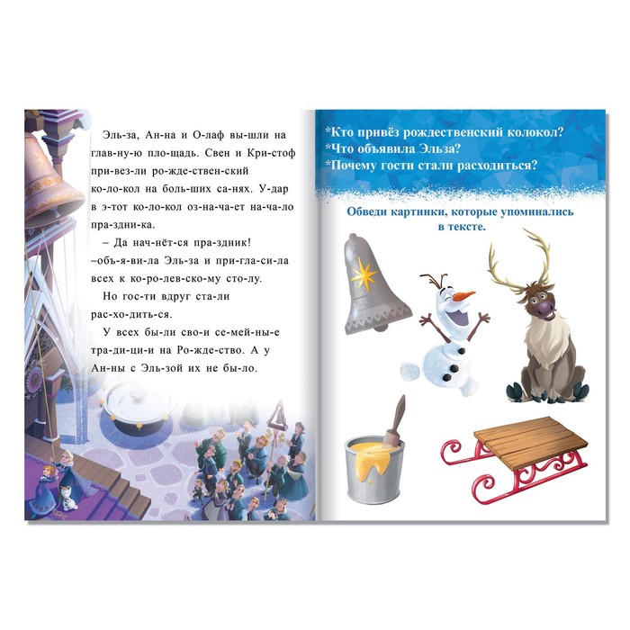 Внутри книги ребёнка ждёт увлекательный рассказ о приключениях любимых героев «Холодного сердца», а также задания, которые повысят его интерес к чтению. Ребёнок должен понимать смысл текста, поэтому не торопите его во время чтения и задавайте дополнительные вопросы о прочитанном.