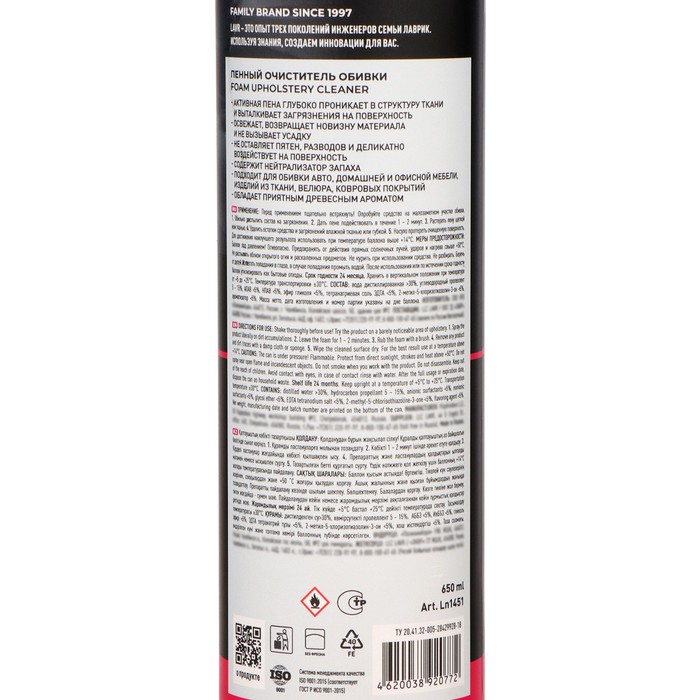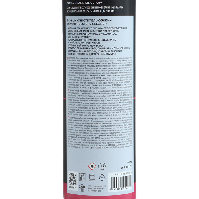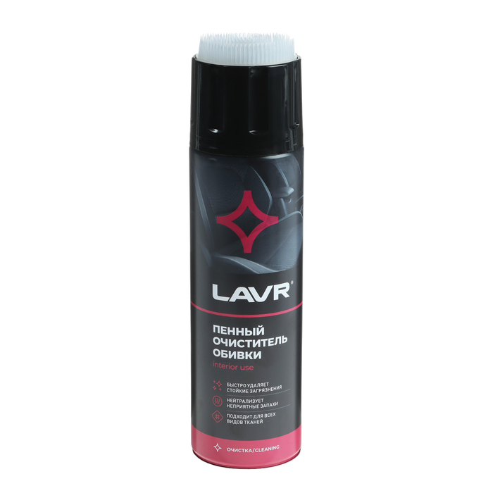 Пенный очиститель обивки LAVR – средство в аэрозольном формате для ухода за тканевой обивкой и коврами в салоне автомобиля, а также в быту.