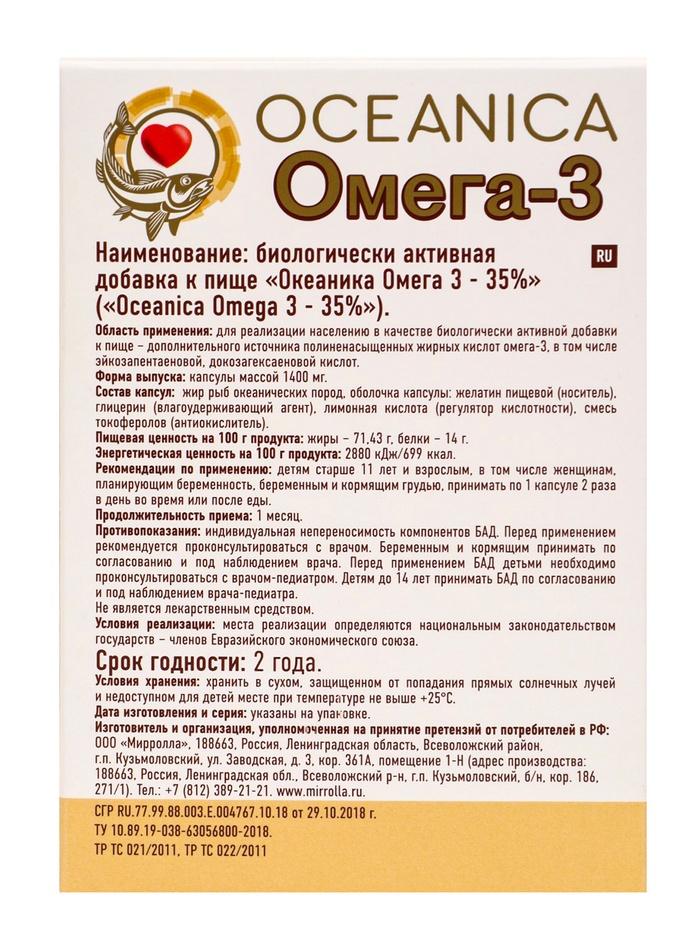 Биологически активная добавка к пище, дополнительный источник полиненасыщенных жирных кислот Омега-3 (эйкозапентаеновой, докозагексаеновой, альфа-линоленовой кислот).