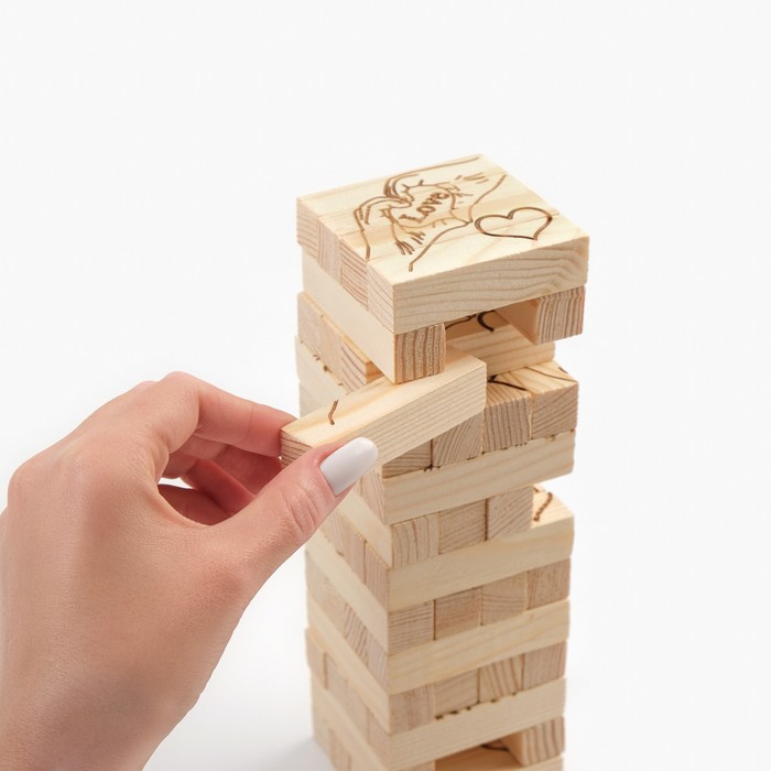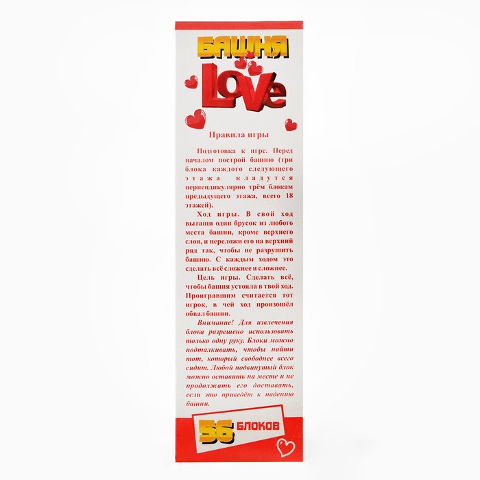 Постройте башню: каждый ряд состоит из трёх брусков, выложенных вплотную друг к другу. Каждый ряд выкладывается поперёк предыдущего. Раунд начинает игрок, который строил башню. По очереди вытягивайте бруски из разных частей башни так, чтобы она не упала. Вытянутые бруски можно складывать на верхушку башни или убирать в сторону. Проигравшим считается тот, в чей ход произошёл обвал башни. Брусочки выполнены в романтическом стиле. Башня станет отличным подарком второй половине на 14 февраля!