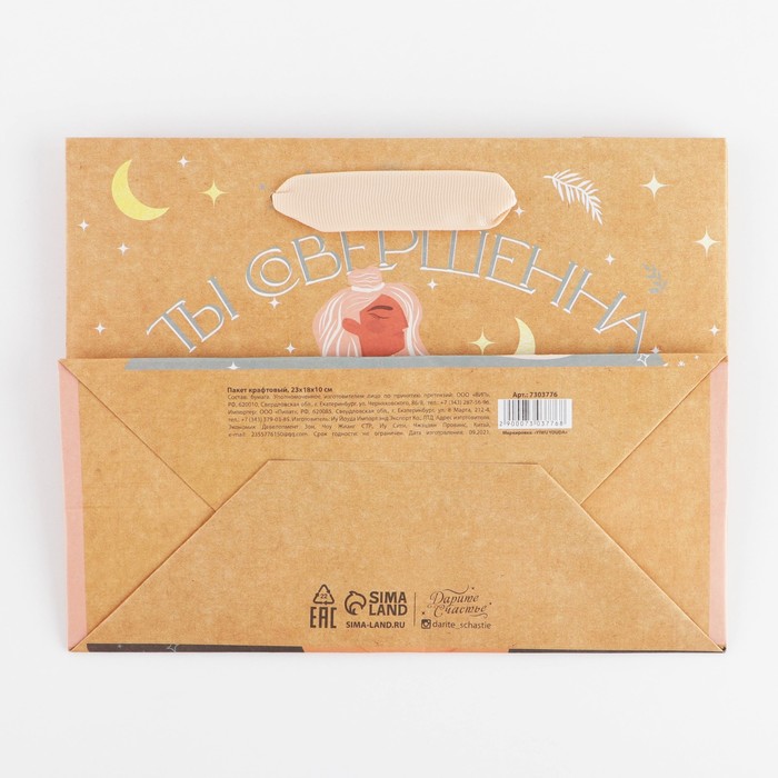 Технические характеристики Пакет подарочный крафтовый, упаковка, «Ты совершенна», MS 23 х 18 х 8 см