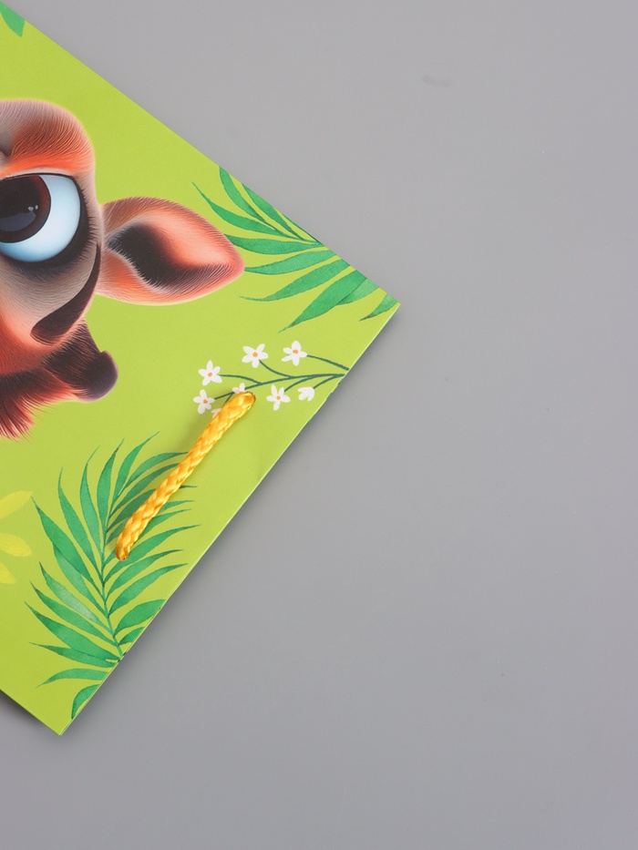 Зелёный цвет с милым другом. Ламинированный подарочный пакет «Маленький большой друг» — это упаковка формата M (18×22,3×10 см) с трогательным дизайном: зверята, цветы, зелень и тёплая надпись. Шнуровые ручки, декоративные элементы, плотность картона 180 г/м², ламинация защищает от влаги.