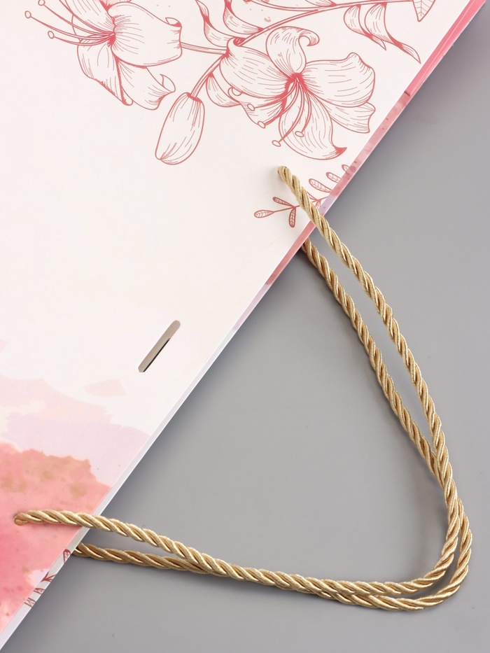 - Ручка-шнур с бантом: Пакет уже завязан — не нужно подбирать ленту, тратить время на упаковку. Ручки выполнены из прочного шнура, выдерживают нагрузку, не врезаются в руки. Бант прикреплён намертво, не развяжется в дороге.