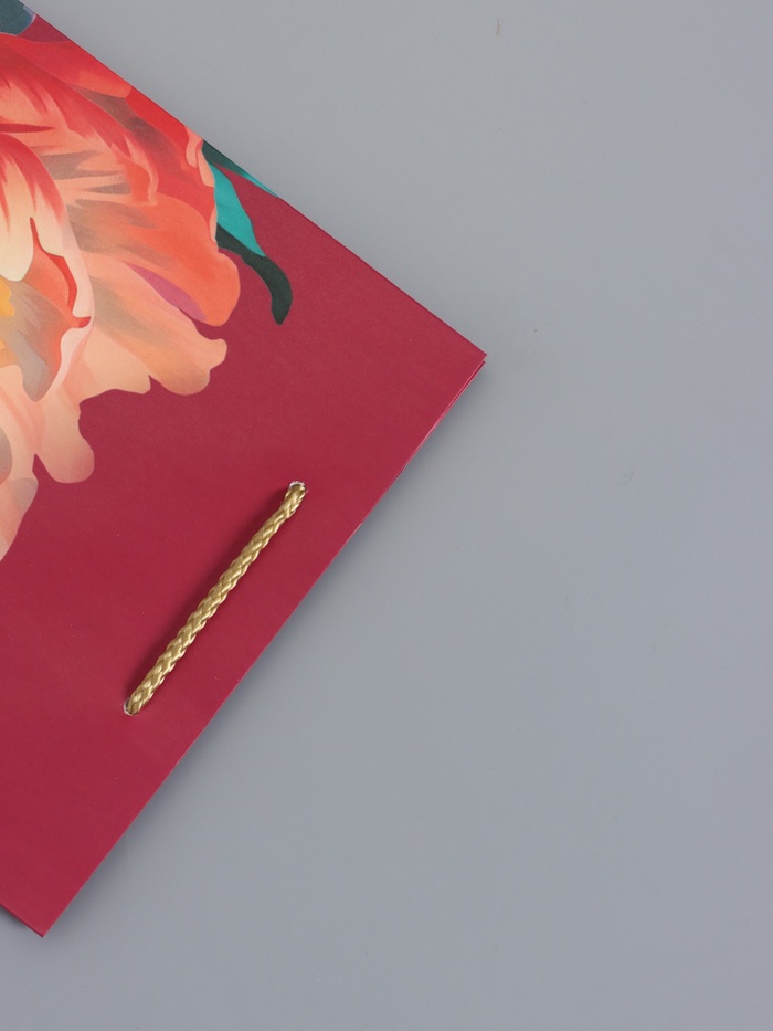 - Удобная шнуровая ручка: Прочный шнур выдерживает вес, обеспечивая комфортную переноску. Дизайн ручки не нарушает целостность изысканного рисунка.