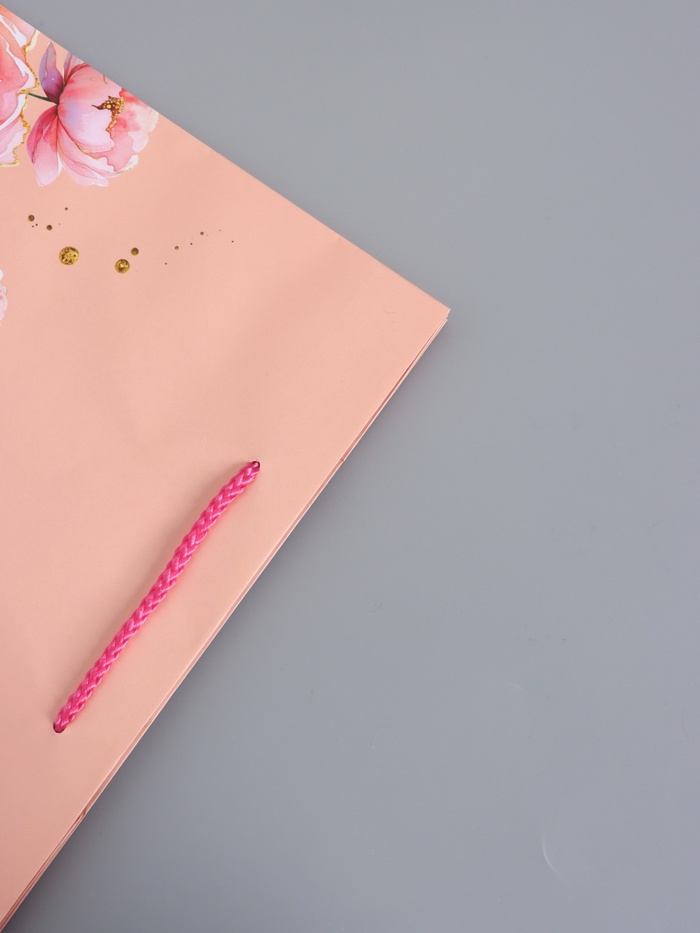 - Удобные и прочные ручки-шнуры: Плетёные ручки обеспечивают удобный хват. Они надёжно закреплены и выдерживают вес стандартного подарка, не доставляя дискомфорта при переноске.