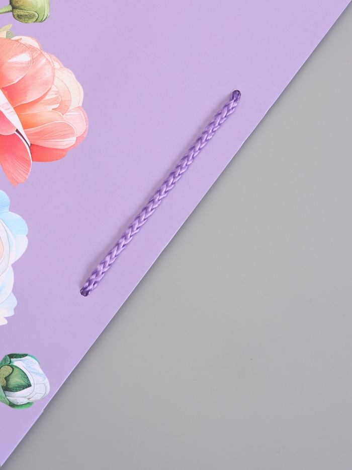 - Ручка-шнур: Пакет укомплектован прочными шнуровыми ручками. Они выдерживают нагрузку, не врезаются в руки. Ручки завязаны узлами, надёжно закреплены, не оторвутся в дороге.
