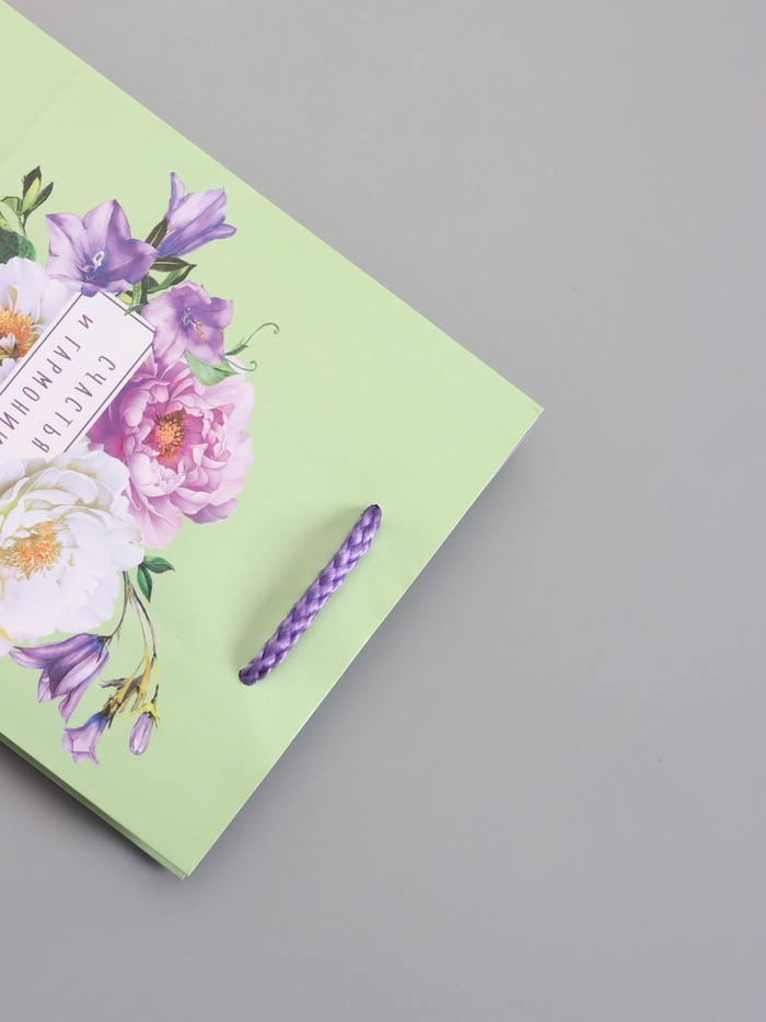 Зелёный цвет с пожеланием счастья и гармонии. Ламинированный подарочный пакет «Счастья и гармонии» — это компактная упаковка размера S (11,5×14,5×6,5 см) с растительным рисунком, тёплой надписью и шнуровыми ручками. Плотность картона 180 г/м², ламинация защищает от влаги.