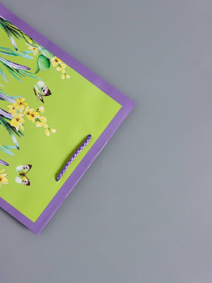Подарок с ароматом летнего луга. Ламинированный подарочный пакет «Цветочное поле» — это упаковка, наполненная жизнью и движением. Сочетание сиреневых соцветий, зелёной листвы и порхающих бабочек создаёт образ цветущего, беззаботного летнего дня.