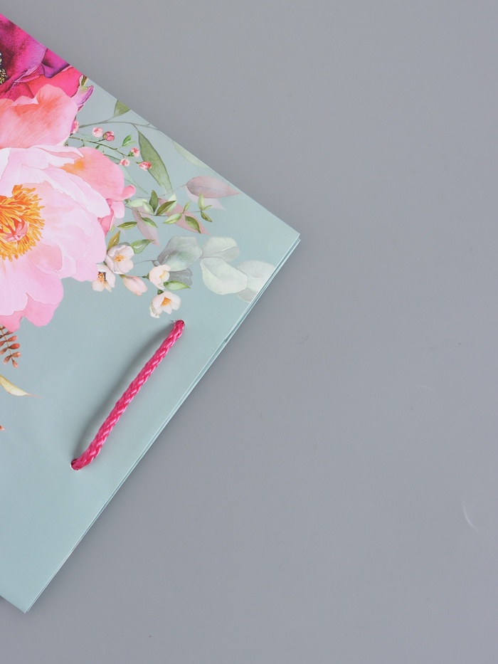 - Дизайн на контрасте стиля и нежности: Серый цвет добавляет образу солидности и современности, а розовые цветочные акценты вносят оживление и тепло. Такой пакет подходит для подарка на 14 Февраля, 8 Марта или как знак внимания женщине с современным вкусом.