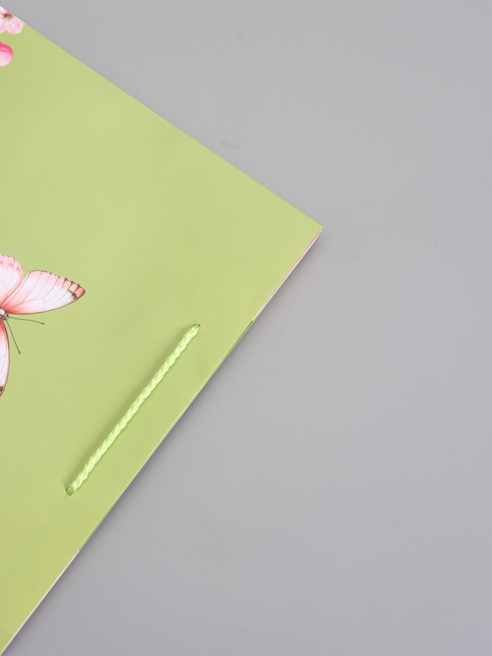 Зелёный цвет с цветами и бабочкой. Ламинированный подарочный пакет «Цветы и бабочка» — это упаковка формата L (26×12×32 см) с нежным природным дизайном: изящные цветы, порхающая бабочка и элегантная надпись. Шнуровые ручки, декоративные элементы, плотность картона 180 г/м², ламинация защищает от влаги.