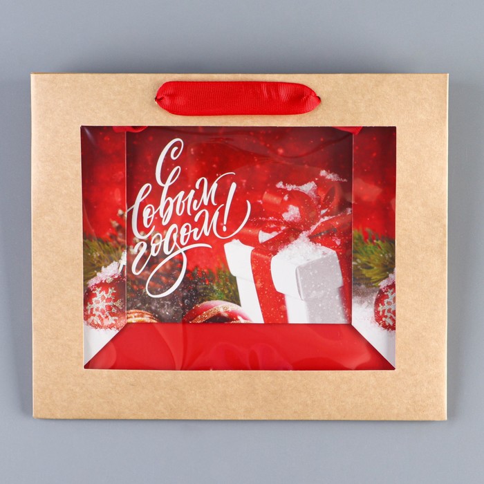 Пакет подарочный новогодний крафтовый с пластиковым окном «Новогодний подарок», 24 х 20 х 11см
