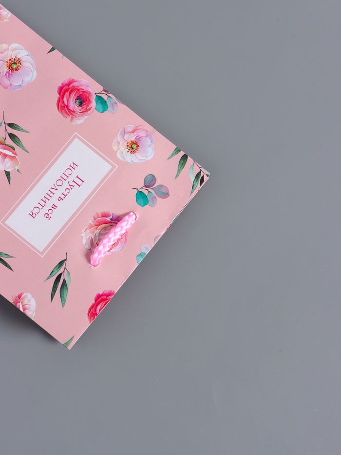 - Яркий акцент в виде надписи: Доминантой дизайна становится доброе пожелание «Пусть всё исполнится», дополненное нежным цветочным орнаментом. Такой пакет не требует дополнительной открытки, передавая ваши мысли напрямую.