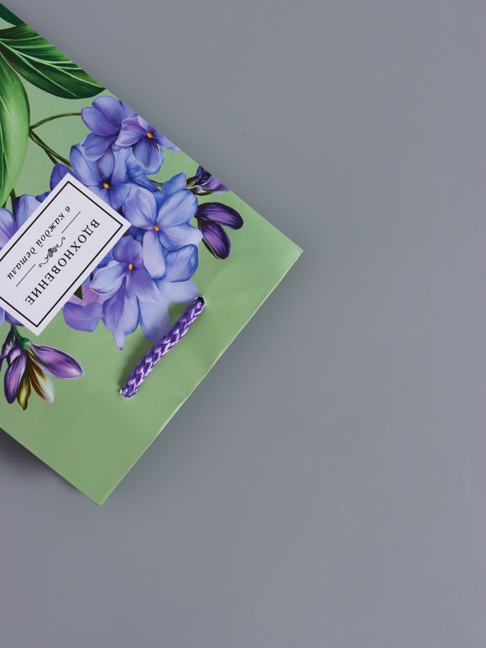 - Дизайн с мотивирующим посылом: Чёткая надпись «Вдохновение» на фоне растительного орнамента делает пакет тематическим. Такой дизайн подходит для подарков, связанных с хобби, творчеством или новыми начинаниями.